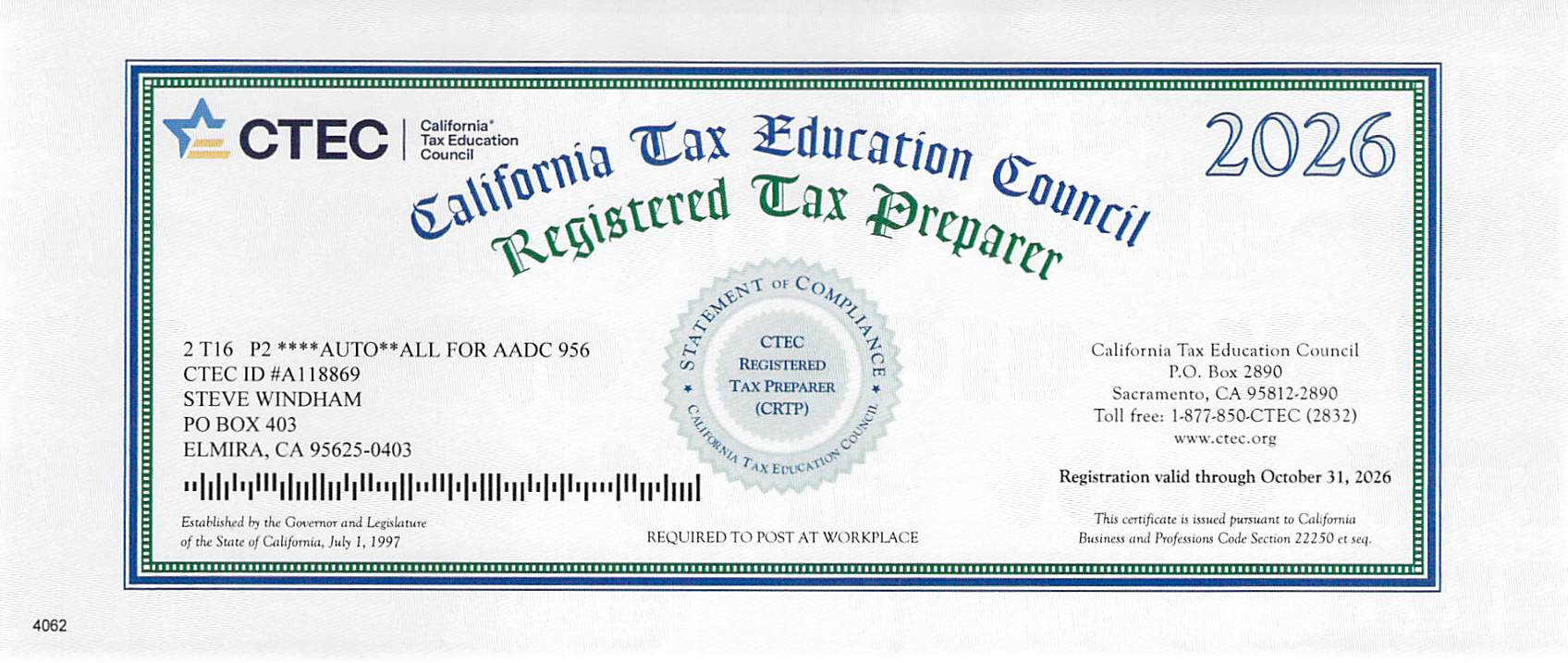 Mr. Windham has been a CTEC Registered Tax Preparer since 2003, and an IRS/US Treasury Enrolled Agent since 2008. Mr. Windham's favorite accounting/taxation activities are tax audits and teaching accounting.